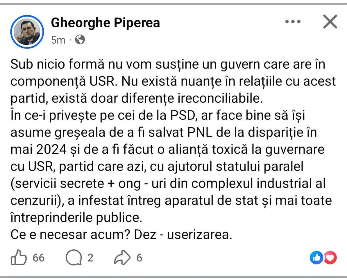 Să facă alianță cu PSD-ul dacă tot ia la măciucă PNL-ul și USR-ul. Sunt foarte curios ce părere ar avea suveraniștii.
