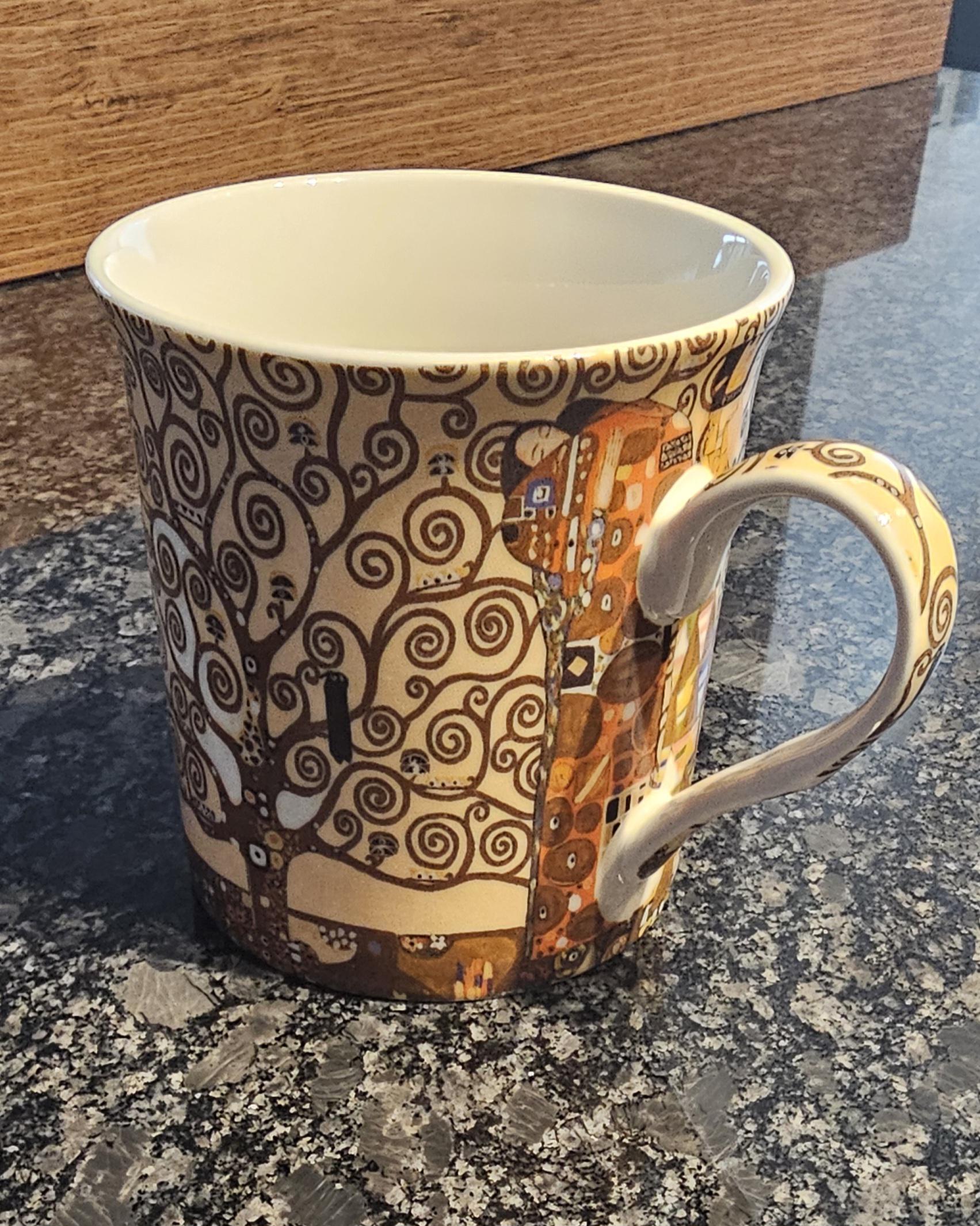 Ecco una tazza con un motivo di Klimt "Il bacio". Da un lato questi souvenir diffondono l’arte e la cultura austriaca in tutto il mondo. D’altro canto non si tratta più di arte o, in alcuni casi, di qualità scadente. Quindi a favore o contro una cosa del genere, cosa ne pensi?