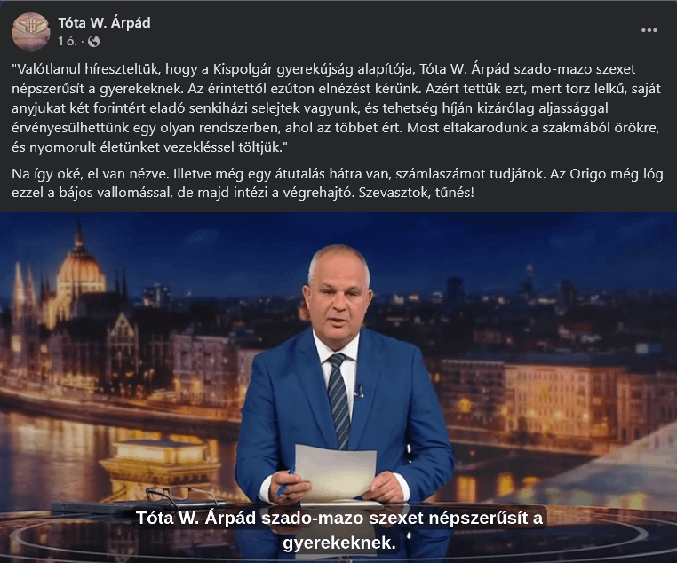"Abbiamo falsamente riferito che il fondatore del giornale per bambini Kispolgár, Árpád W. Tóta, promuove il sesso sado-masochista per i bambini. Ci scusiamo con la persona interessata. Lo abbiamo fatto perché siamo anime depravate che vendono le proprie madri per due fiorini e, a causa della nostra mancanza di talento, potevamo prevalere solo con meschinità in un sistema dove valeva di più. Ora ci nascondiamo per sempre dalla professione e trascorriamo le nostre miserabili vite in penitenza."