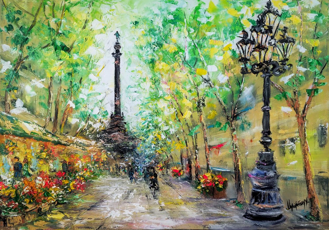 Ciao a tutti, vorrei condividere con voi questo dipinto che ho terminato da poco. Si tratta di un’interpretazione artistica ispirata all’antica Rambla de les Flors, quando sul lungomare c’erano bancarelle di fiori. Non è una scena attuale, ma la mia visione del luogo. Spero che ti piaccia.
