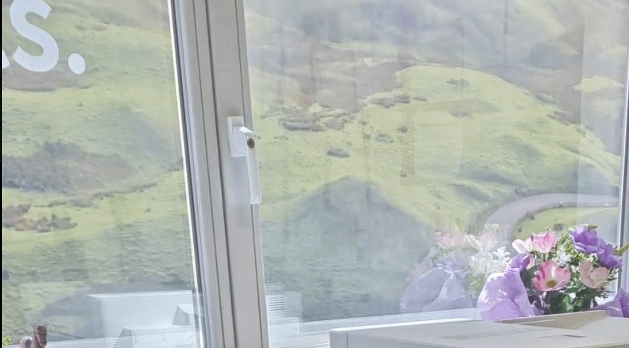 The picture shows a view through a window with a white frame and a small white handle/latch in the center. Beyond the glass is a scenic landscape of rolling green hills with soft, rounded contours. A winding road curves through the hills on the right side of the frame.