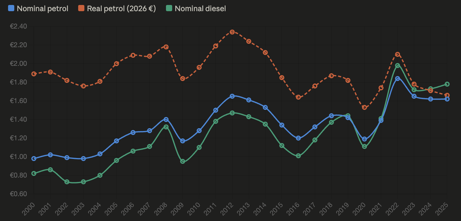 Quando si calcola il prezzo della benzina con l’inflazione, gli 80 centesimi del 2000 corrispondono al nostro prezzo attuale.