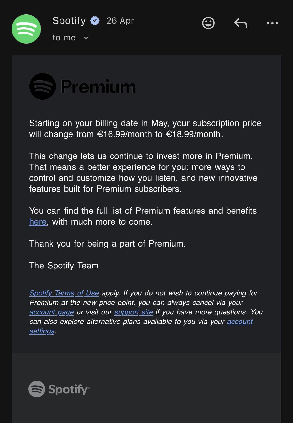 Ho ricevuto un’e-mail da Spotify oggi, il piano Duo in Irlanda passerà da € 16,99 a € 18,99 (era € 14,99 2 anni fa). Si tratta di un aumento del 26% in soli 2 anni. Capisco che i prezzi salgano, ma questo sembra molto fuori sincronia con l’inflazione effettiva.