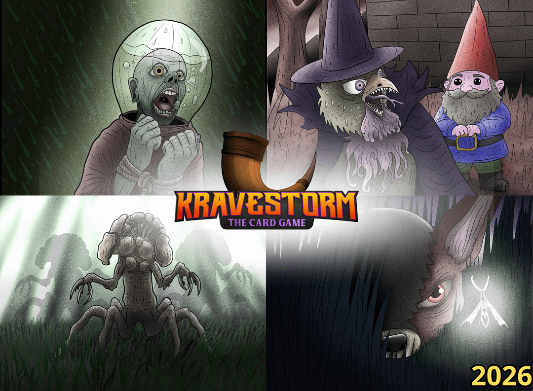 Nel 2023, non so spiegare esattamente il motivo, ho sentito l’urgenza di creare ancora una volta un gioco. Come a "scherzo"ho sviluppato un gioco chiamato "Missioni, bestie e altre stronzate**" da portare a un incontro segreto con Babbo Natale (una vecchia tradizione del mio gruppo di amici del liceo). Quello che era iniziato come uno scherzo leggero e disinvolto è diventato un’ossessione e negli ultimi 3 anni l’ho evoluto fino a diventare un gioco di carte chiamato Kravestorm. Descrivo questo gioco come: "combattente di carte basato sulla formazione alimentato dal potere autodistruttivo".