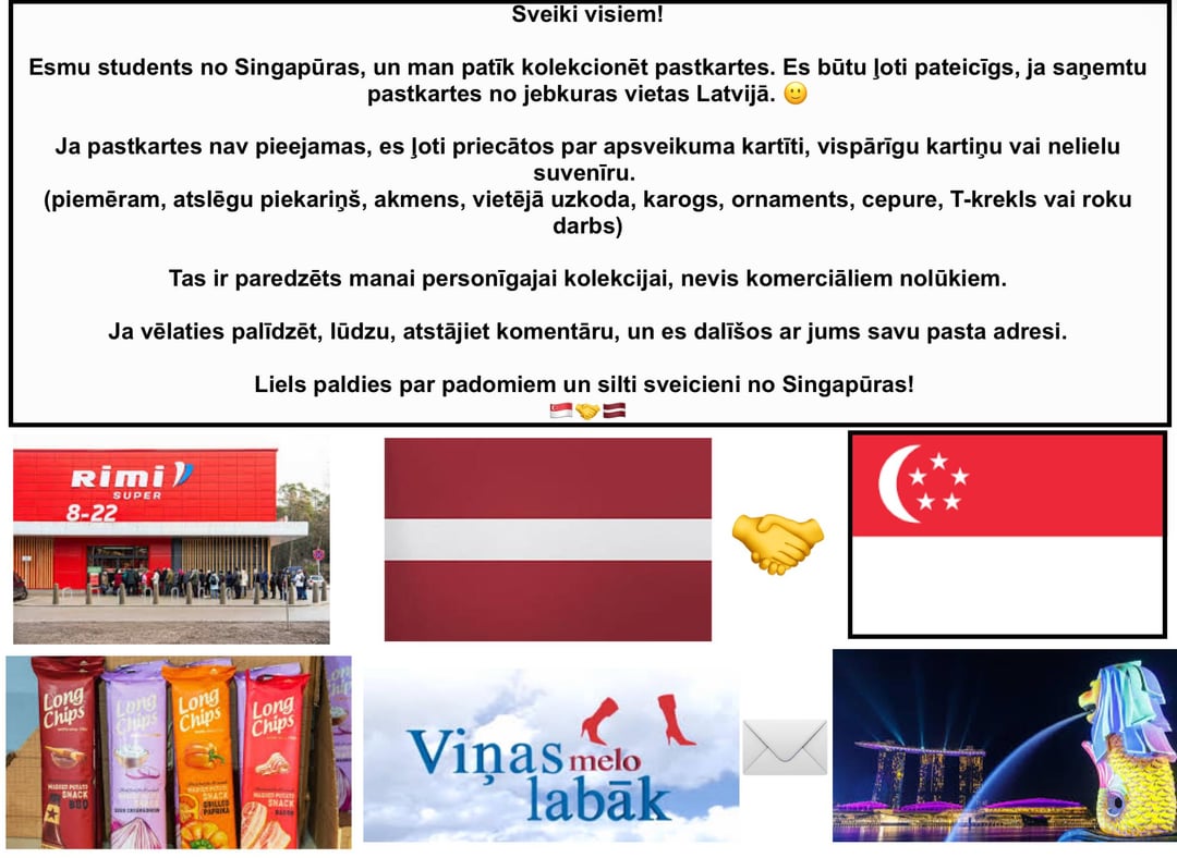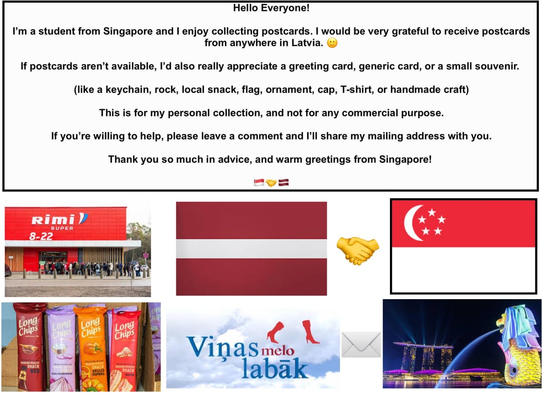 Sono uno studente di Singapore e mi piace collezionare cartoline. Sarei molto grato di ricevere cartoline da qualsiasi parte della Lettonia. 🙂