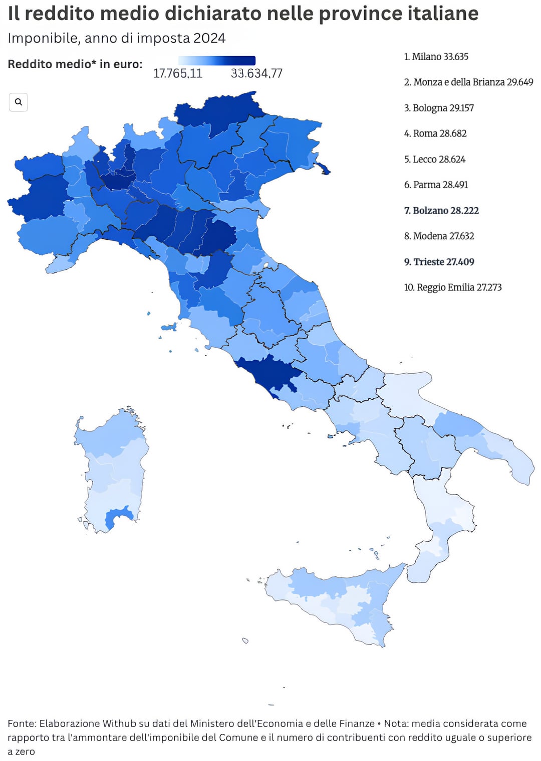 Conub ha fatto la mappa sul reddito medio per provincia, mappa interattiva qui. E’ la prima immagine.