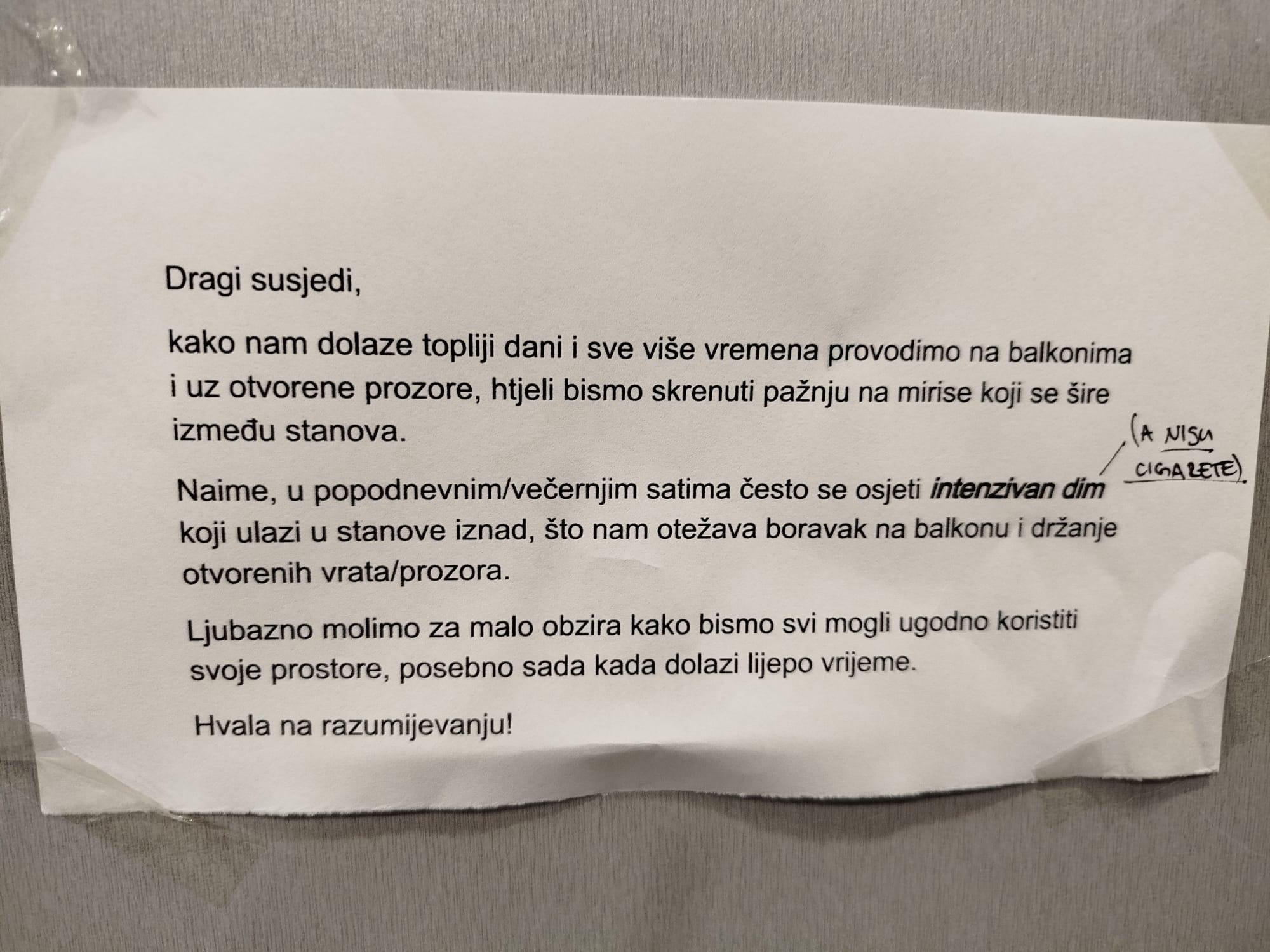 1. Klasična shema mog susjeda i susjede iznad njega. Lik izađe van zatvorit vrata za sobom i dimi nekaj najsmrdljivije kaj postoji (nije vutra), jer mu žena neda u stanu. I sav taj smradu ravno u stan iznad susjedi koja ne puši. Njen stan smrdi ko kotlovnica a njegov miriše.