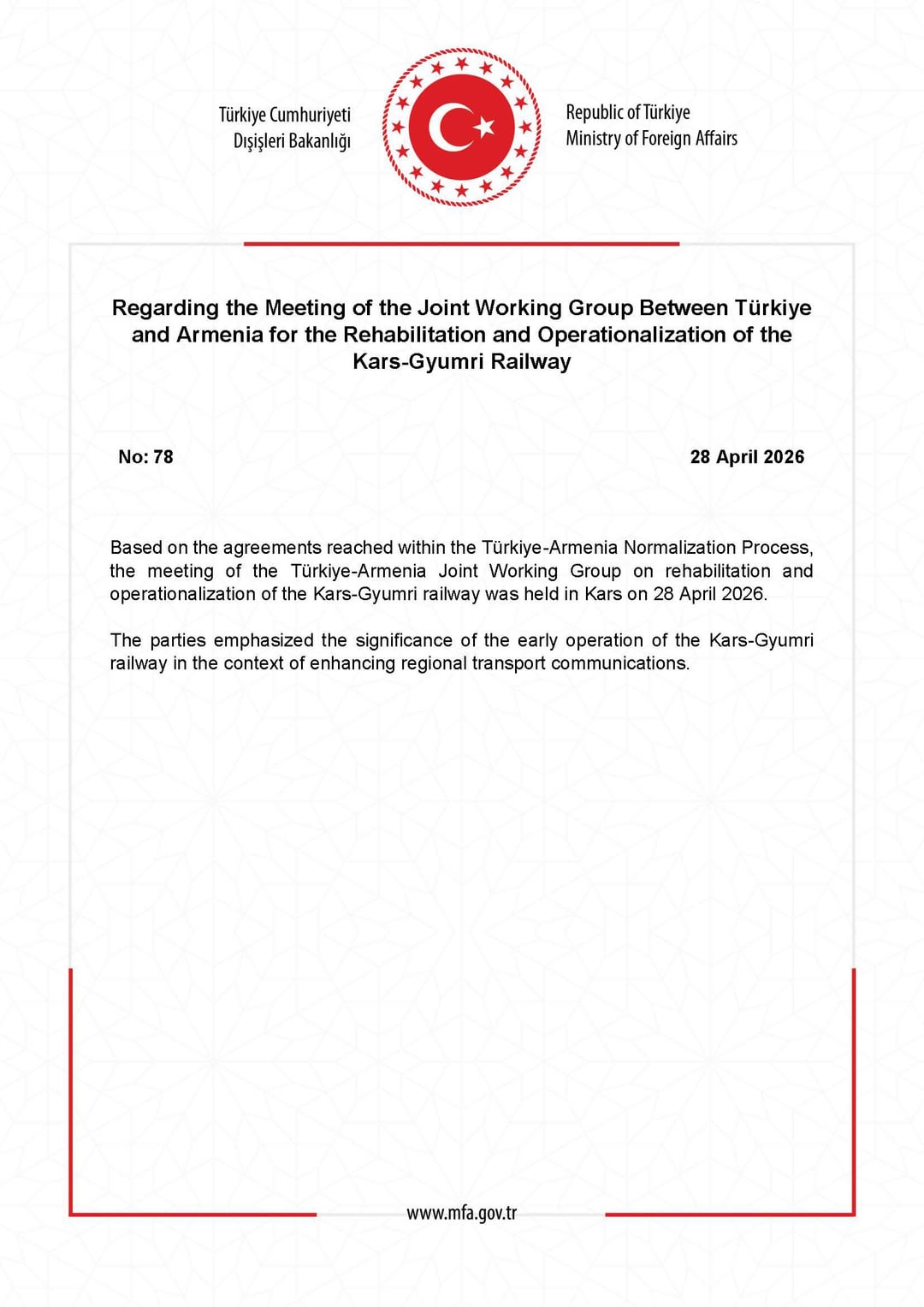 Sulla base degli accordi raggiunti nell’ambito del processo di normalizzazione Armenia-Türkiye, il 28 aprile 2026 si è tenuta a Kars la riunione del gruppo di lavoro congiunto Armenia-Türkiye sulla riabilitazione e l’operatività della ferrovia Gyumri-Kars.