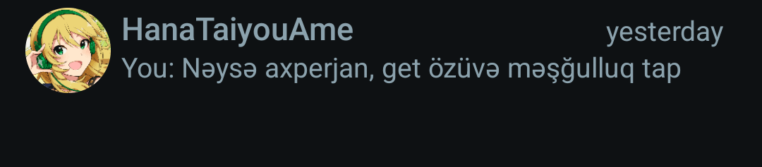 Bu şəxsin əvvəlki nicki başqa idi. Gəncəli idi. Və dəhşət Bakılılara, rus dili bilənlərə nifrəti var idi. Çox radikal danışırdı bu barədə. İndi anime pp qoyub və adını dəyişib bakılı əlavə edib. Elə bilir bəlli deyil ahsjdnd