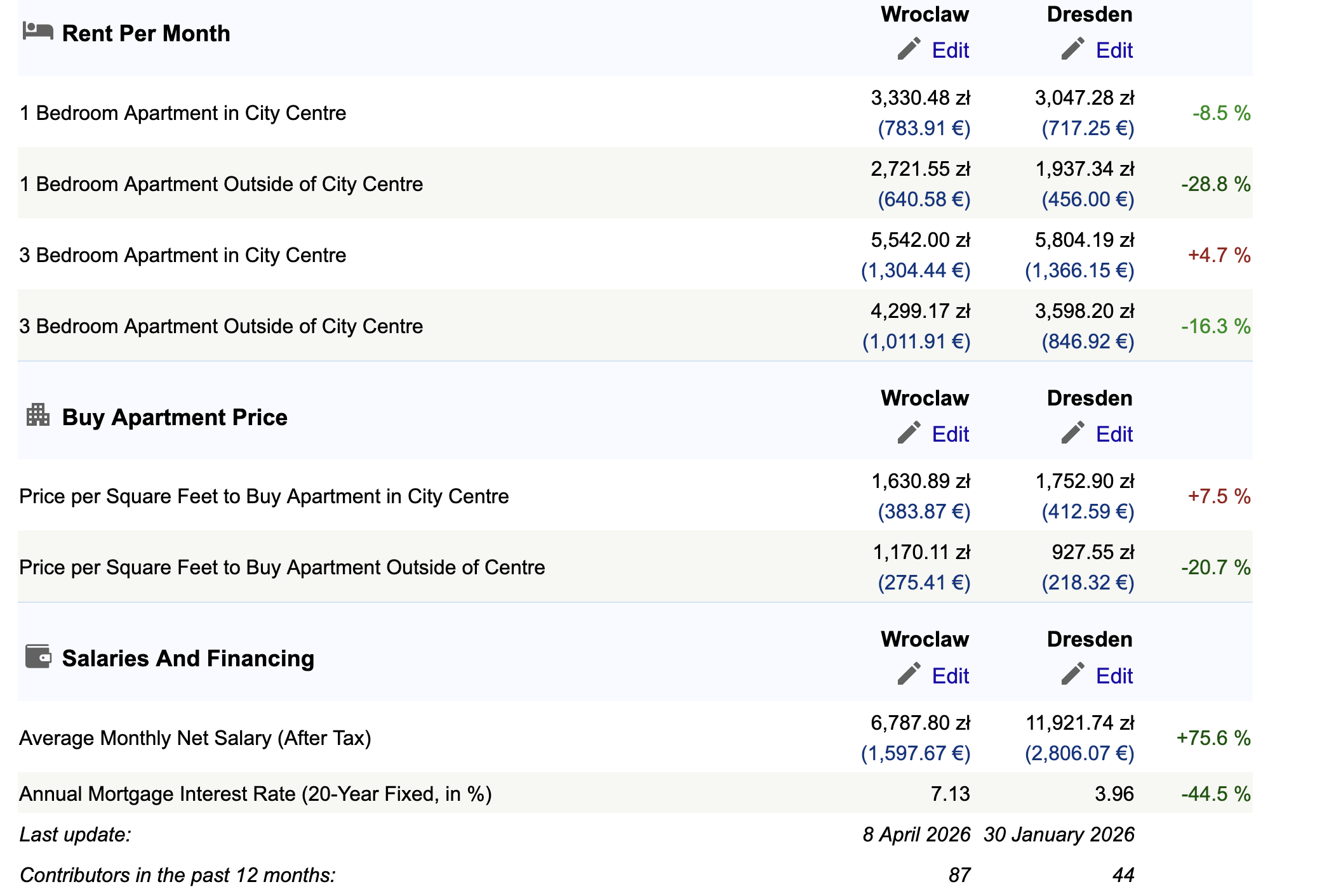 To tylko koszty mieszkań. W Niemczech są dużo wyższe koszty usług, internetu, restauracji itp. Nawet jeżeli mieszkanie taniej się wynajmie w Dreźnie to koszty życia będą niższe we Wrocławiu (abstrahując już od pensji bo wiadomo, że niższe koszty życia we Wrocławiu nie zrekompensują takiej różnicy w zarobkach ale nikt tutaj Ameryki nie odkrył, że Niemcy są bogatsze od Polski).