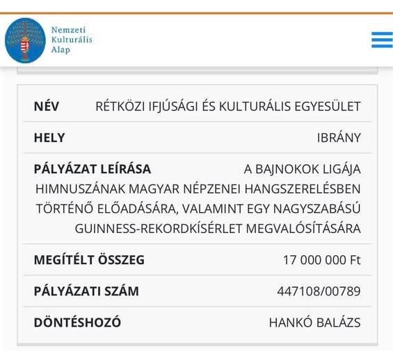 Ha donato 17 milioni di fiorini per l’esecuzione dell’inno della Champions League in un arrangiamento di musica popolare ungherese