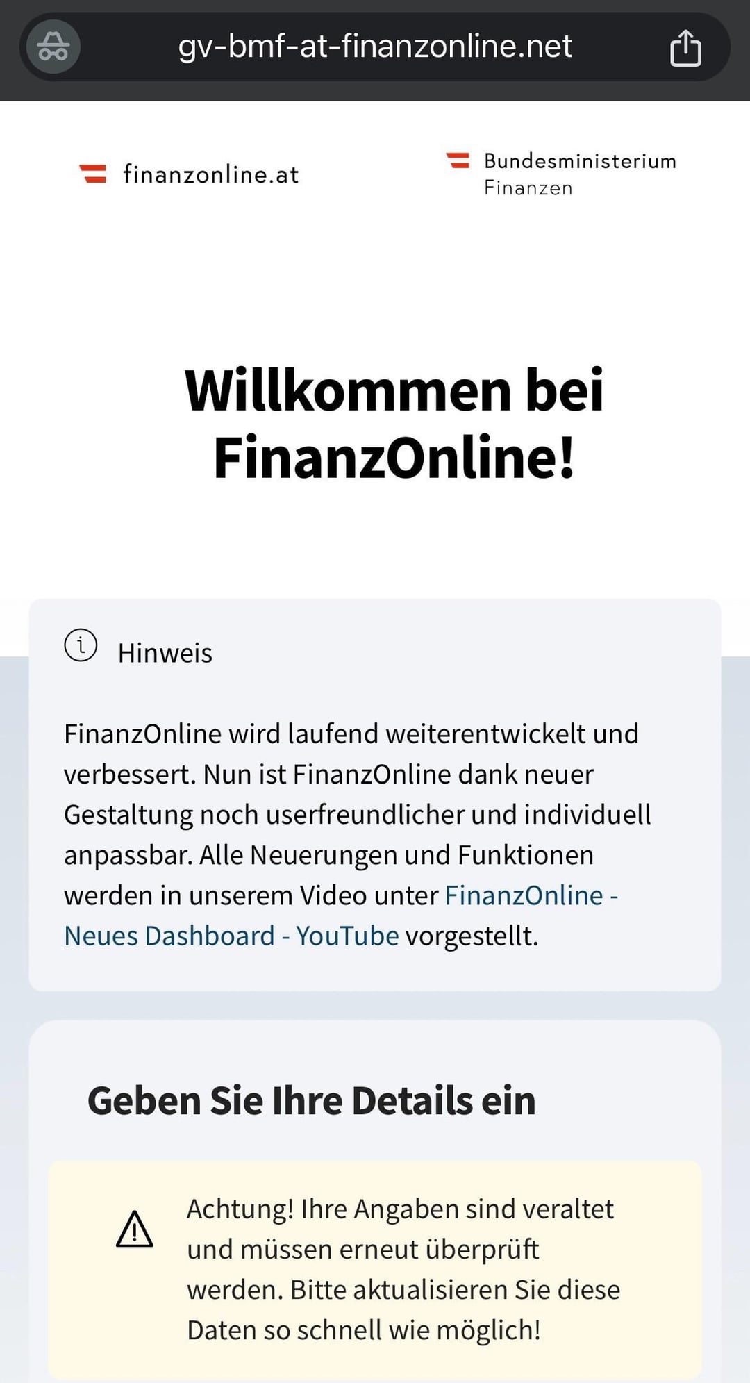 >I am writing to report a fraudulent website found at [**gv-bmf-at-finanzonline.net**](http://gv-bmf-at-finanzonline.net), which I discovered through an SMS spam campaign. The website is impersonating the Austrian tax office’s official site, [**https://finanzonline.bmf.gv.at/fon/**](https://finanzonline.bmf.gv.at/fon/), likely to deceive users and collect sensitive information.