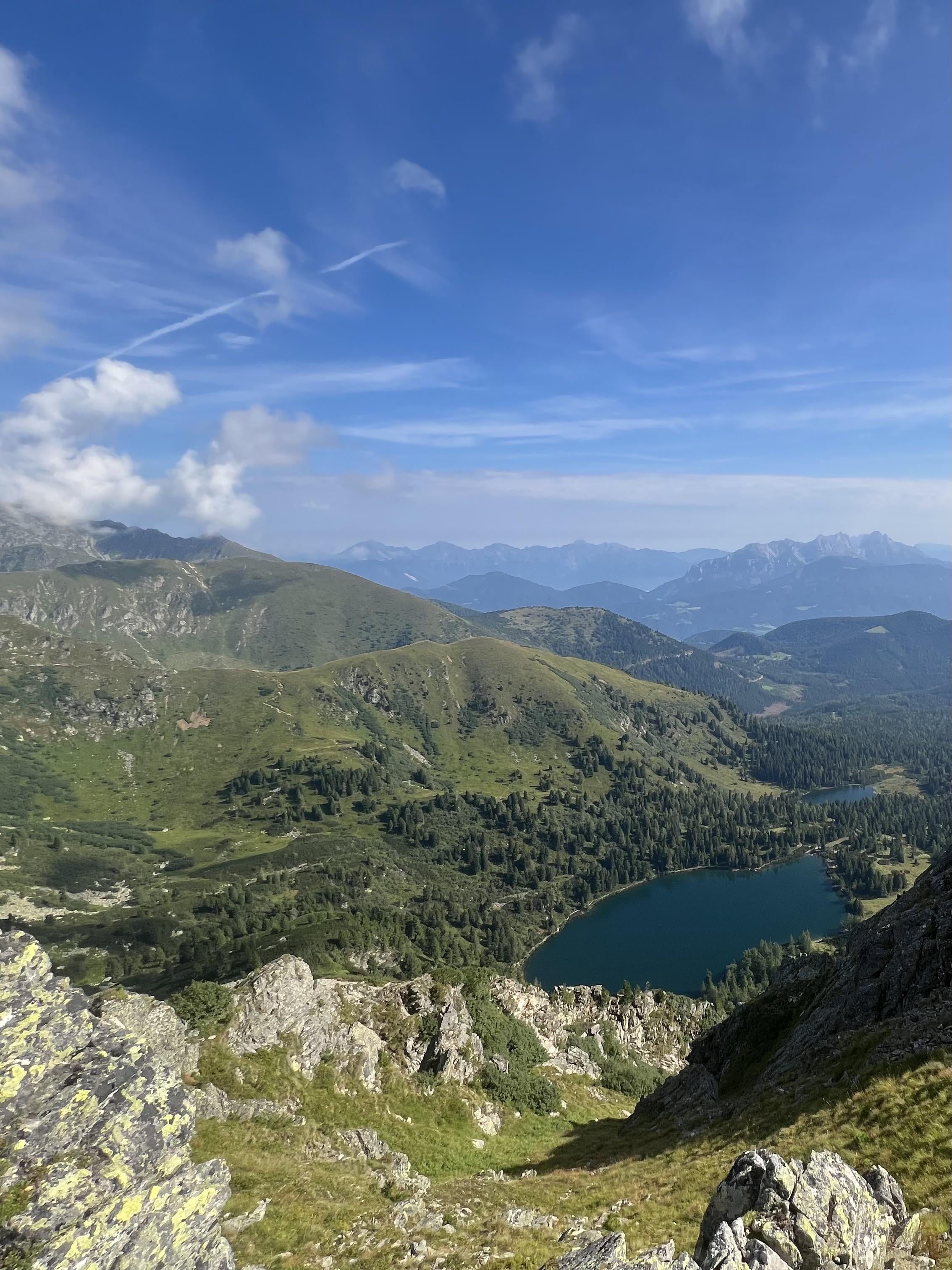 Il crinale al centro, più in secondo piano, partendo da sinistra, mostra il Gr. Pyhrgas, Scheiblingstein, Kreuzmauer e l’Hexenturm per evidenziare le vette impressionanti – sentitevi liberi di correggere eventuali errori.
