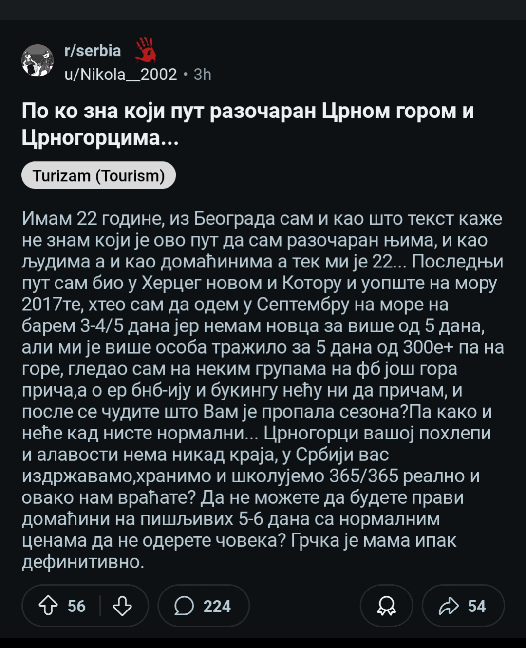 Ovaj je momak isfrustriran zbog svog siromaštva i jer misli da bi trebao letovati za džabe, pa iz srdžbe što nema para pljuje Crnu Goru.