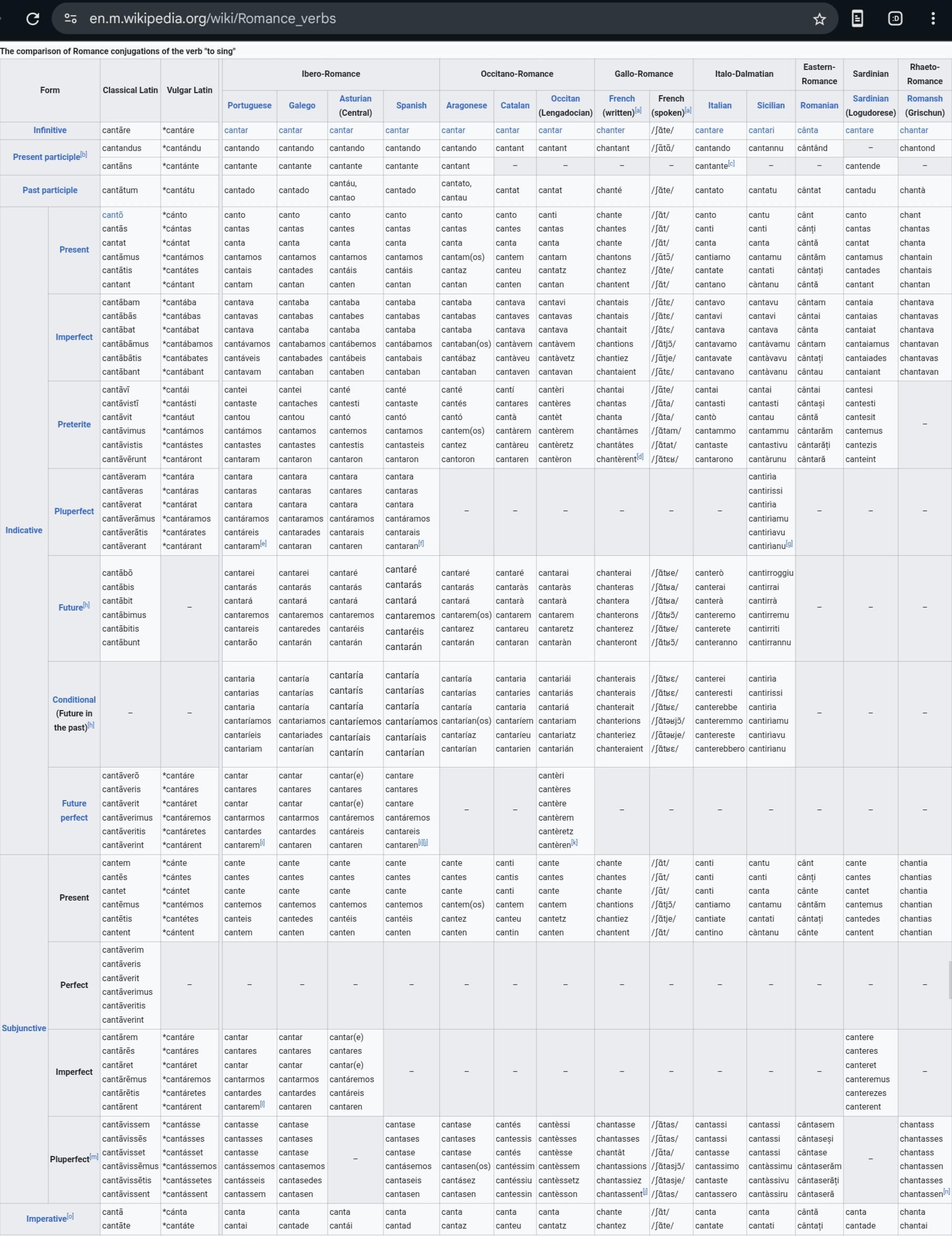 Coniugazioni di un verbo regolare in una tavola gigante che confronta la fonologia francese e alcune ma non tutte le molte lingue latine alle "Verbi romantici" Pagina alla versione inglese di Wikipedia al seguente link: https://en.m.wikipedia.org/wiki/romance_verbs