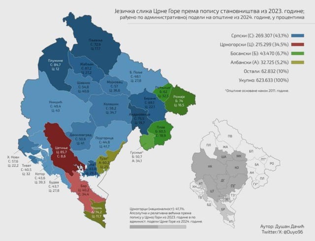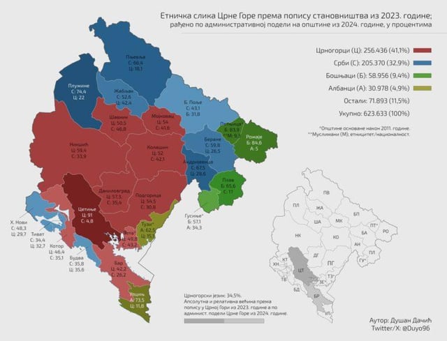 Struttura nazionale e linguistica dei comuni del Montenegro, dati del censimento del 2023. (Foto: Dušan Dačić / Cartography) https://www.reddit.com/gallery/1n6teds di XA3MAT