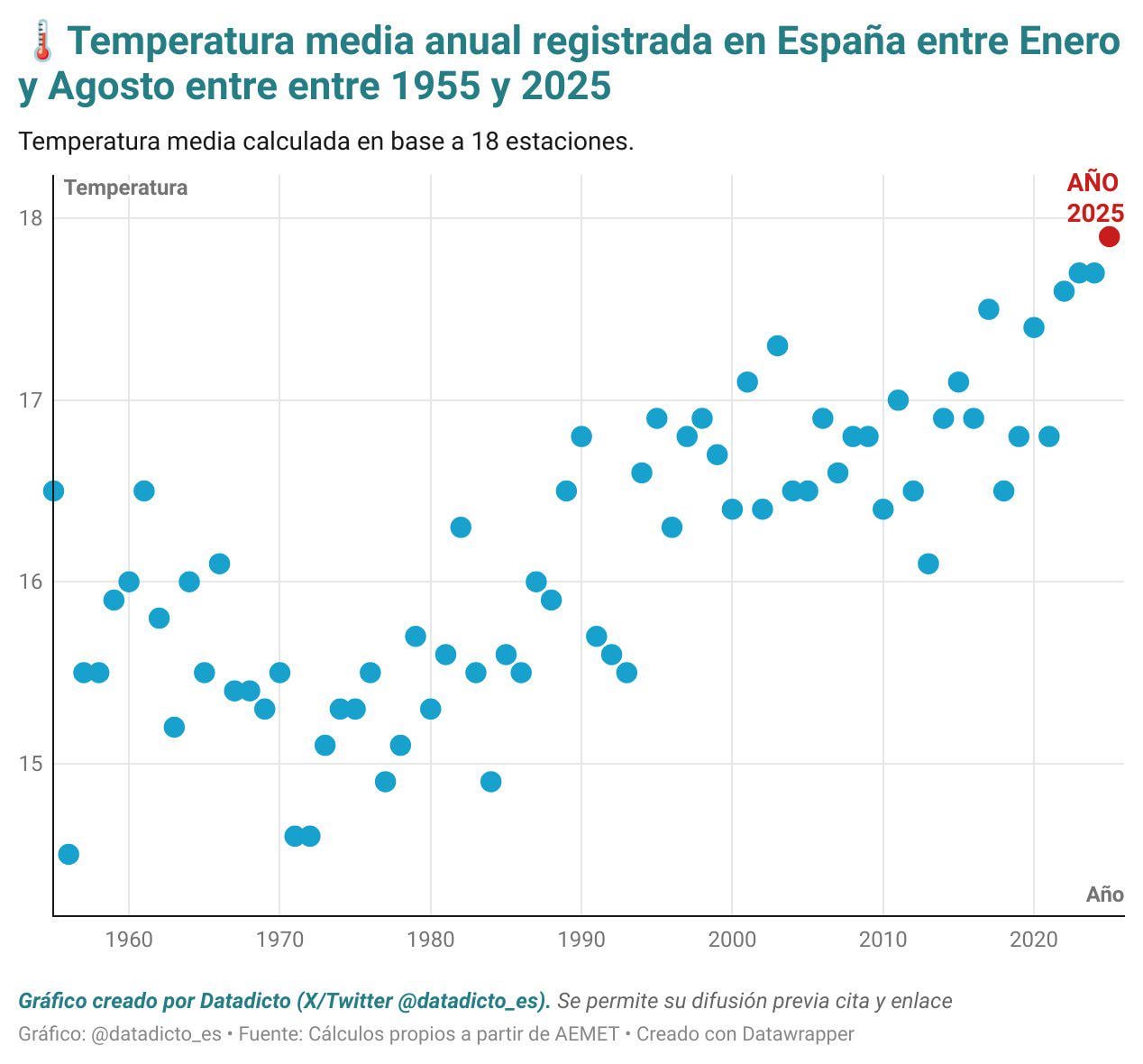 Tra gennaio e agosto, la Spagna ha registrato una temperatura media di 17,9º, essendo al momento la più calda poiché ci sono record. 2025 – 17,9º 2024 – 17,7º 2023 – 17,7º