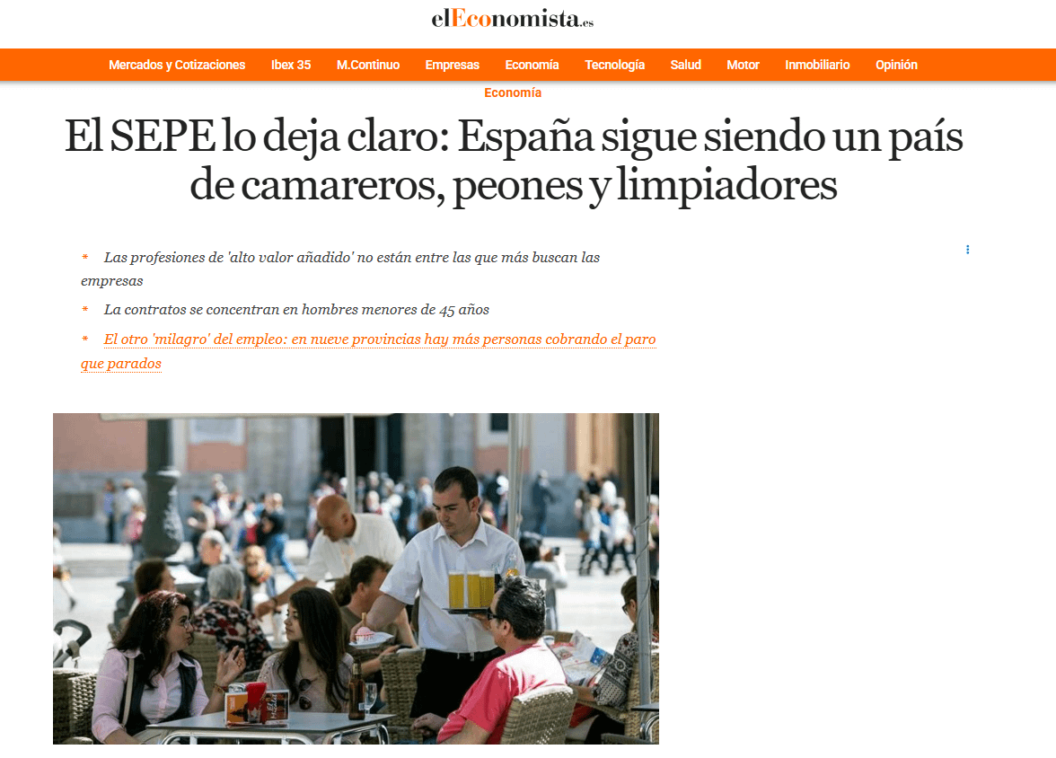Le posizioni più assunte non corrispondono a coloro che cercano i disoccupati. Infatti, L’occupazione più richiesta è il personale di puliziaindicato dal 10,5% dei disoccupati registrati, seguito dall’8,9% "Dipendente dal commercio"; dipendenti amministrativi, con 7,15%; Le pedine dell’industria manifatturiera, che ottengono il 4,92%; e i camerieri, con il 3,53%.