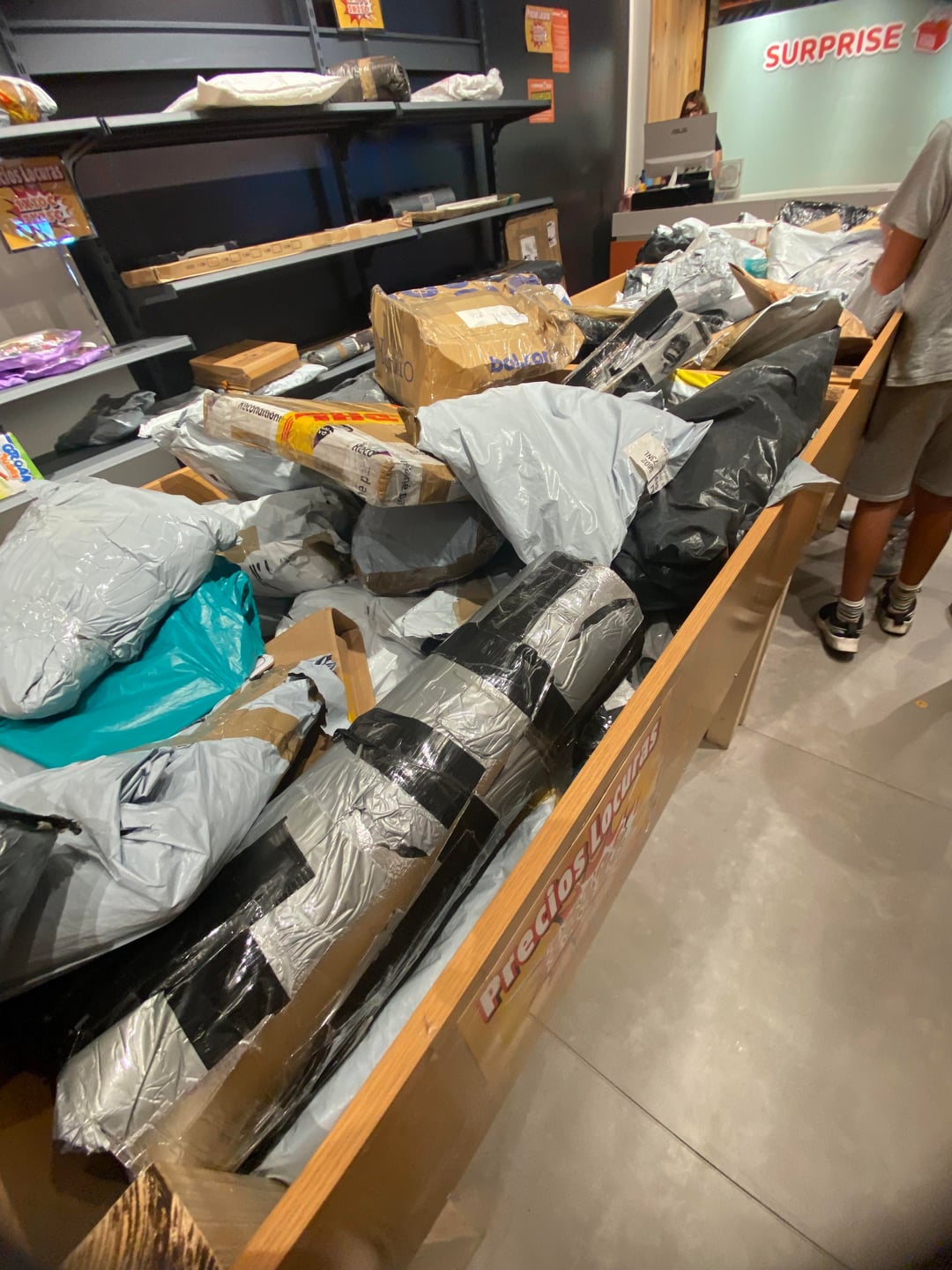 En Barna hay otra tienda igual y venden los paquetes a 20€/kg , muchos de Amazon otros de aliexpres, Temu .. hay una balanza, los pesas y sabes cuánto vale