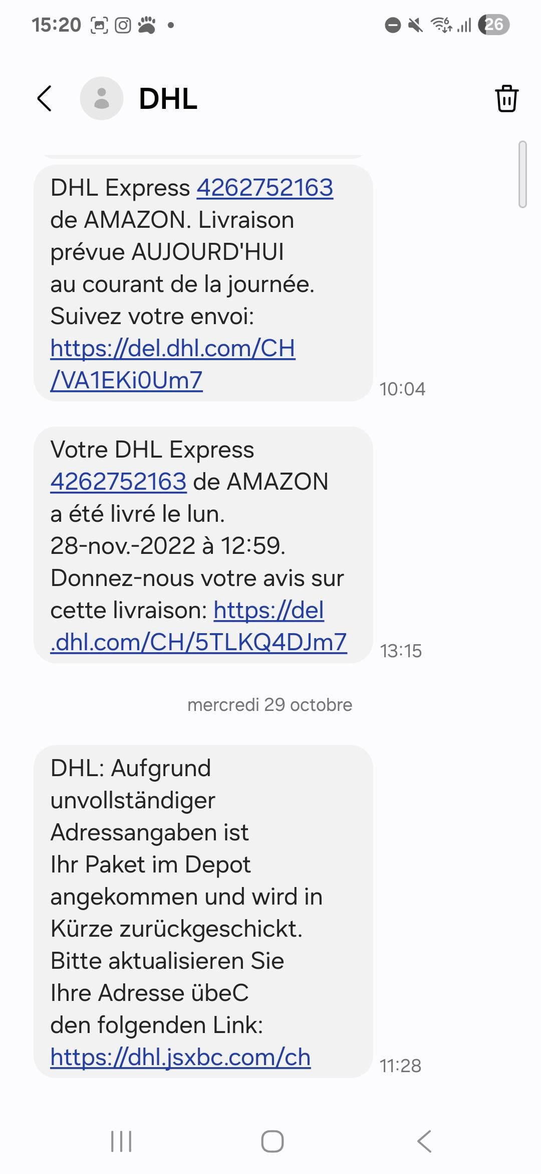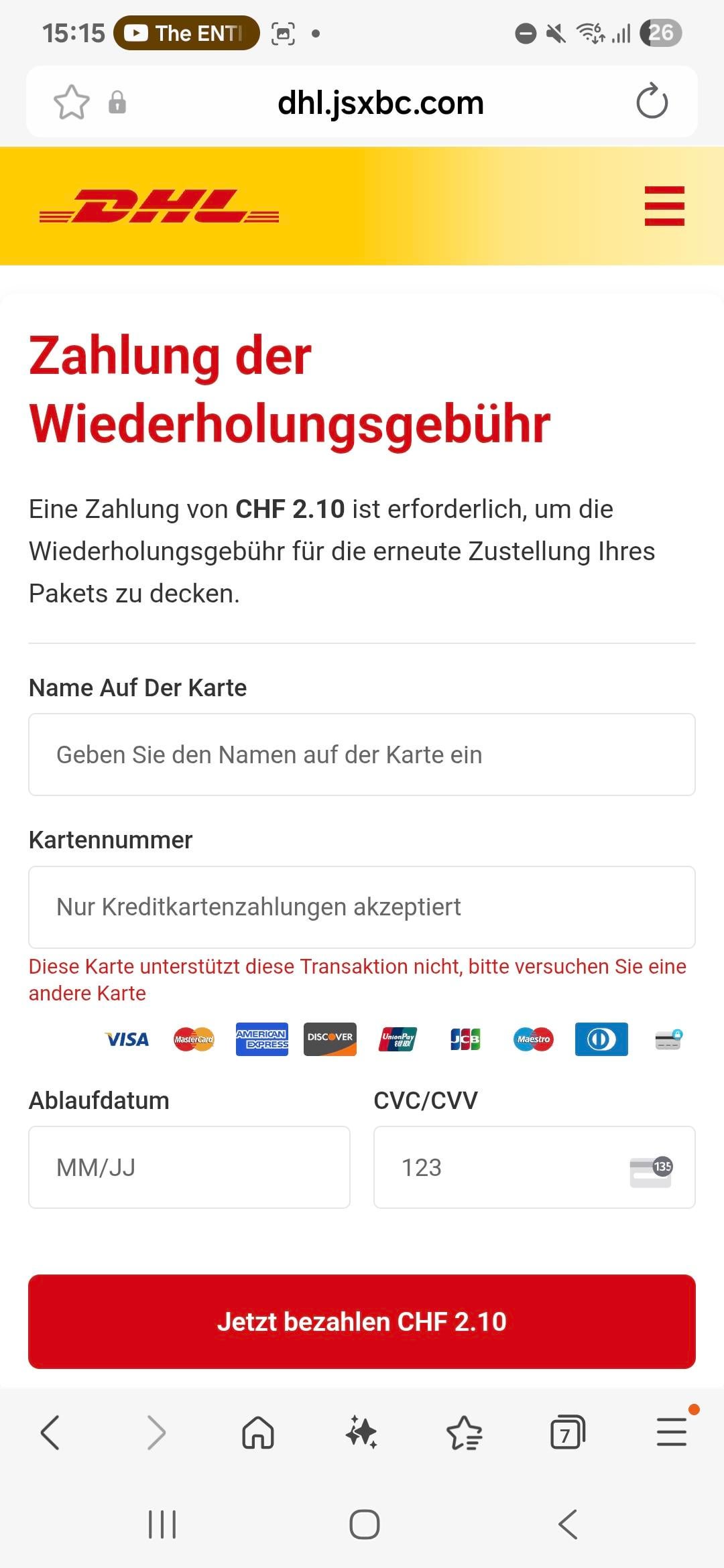 Ho appena ricevuto uno strano messaggio da DHL che sembra sospetto in quanto il collegamento non corrisponde al solito collegamento inviato per pagare le tasse svizzere.