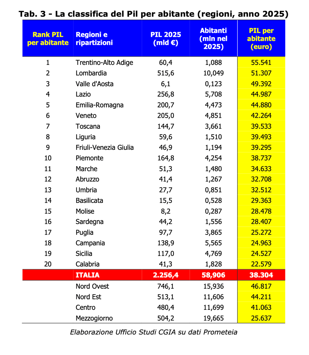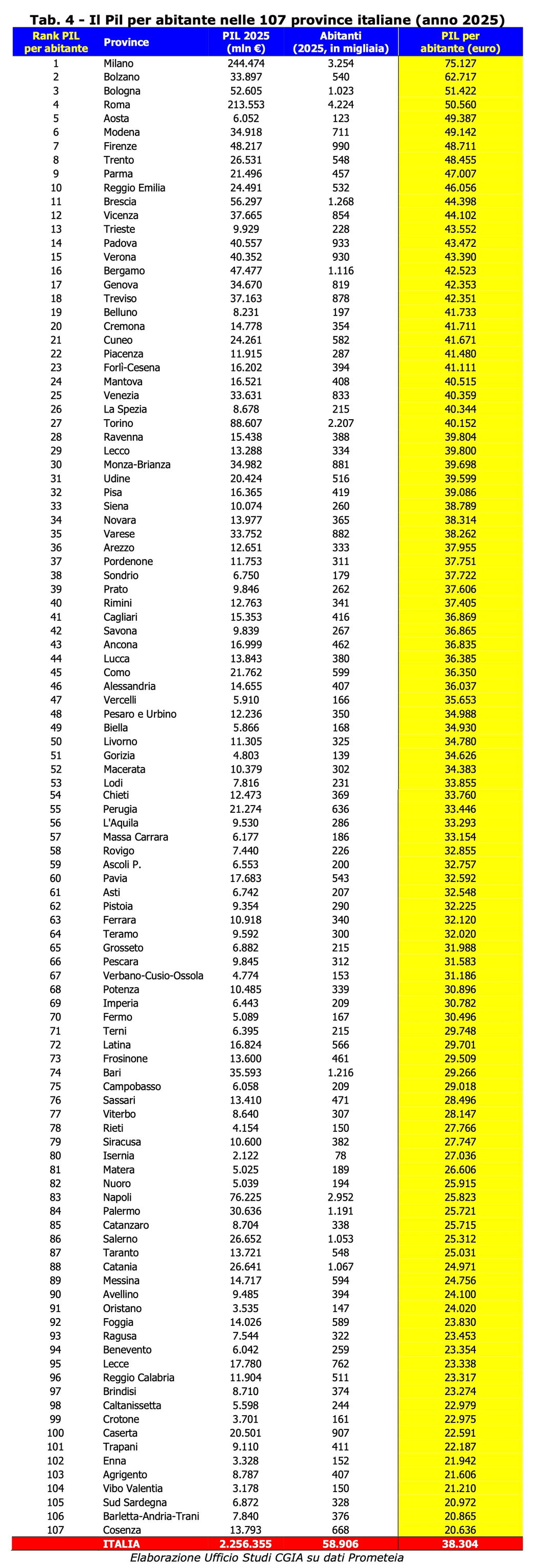 PIL per abitante nel 2025 (regioni e province)