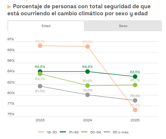 Las redes sociales se han convertido en un hervidero de propaganda reaccionaria desde que ganó Trump y todas las tecnológicas fueron a lamerle las botas. Los jóvenes son el grupo social más expuesto a esto y oh, sorpresa! está influyendo desmedidamente sobre ellos. El porcentaje ha bajado en un año casi 15 puntos, es una bajada importante, no sé por qué la minimizáis. La bajada es EN UN AÑO. No se han dado cuenta mágicamente y en tiempo récord de que el cambio climático no les importa, les están comiendo la cabeza desde las redes sociales.