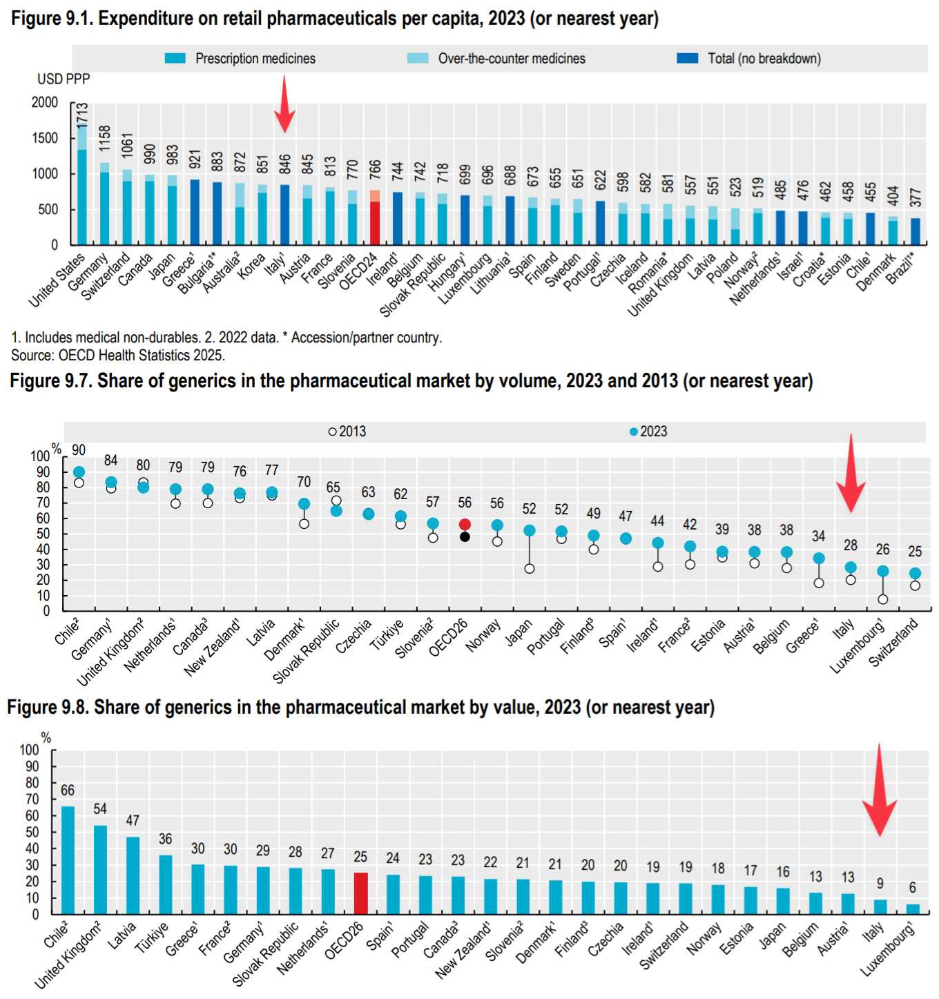 Scarsa penetrazione dei farmaci generici e biosimilari. Il nostro paese rimane ai livelli più bassi dell’area Ocse per quota di mercato dei farmaci equivalenti. Mentre altre nazioni contengono i costi affidandosi a principi attivi identici ma a prezzo inferiore, in Italia si continua a privilegiare il farmaco "marca"o originatore, che costa di più al Sistema sanitario nazionale.
