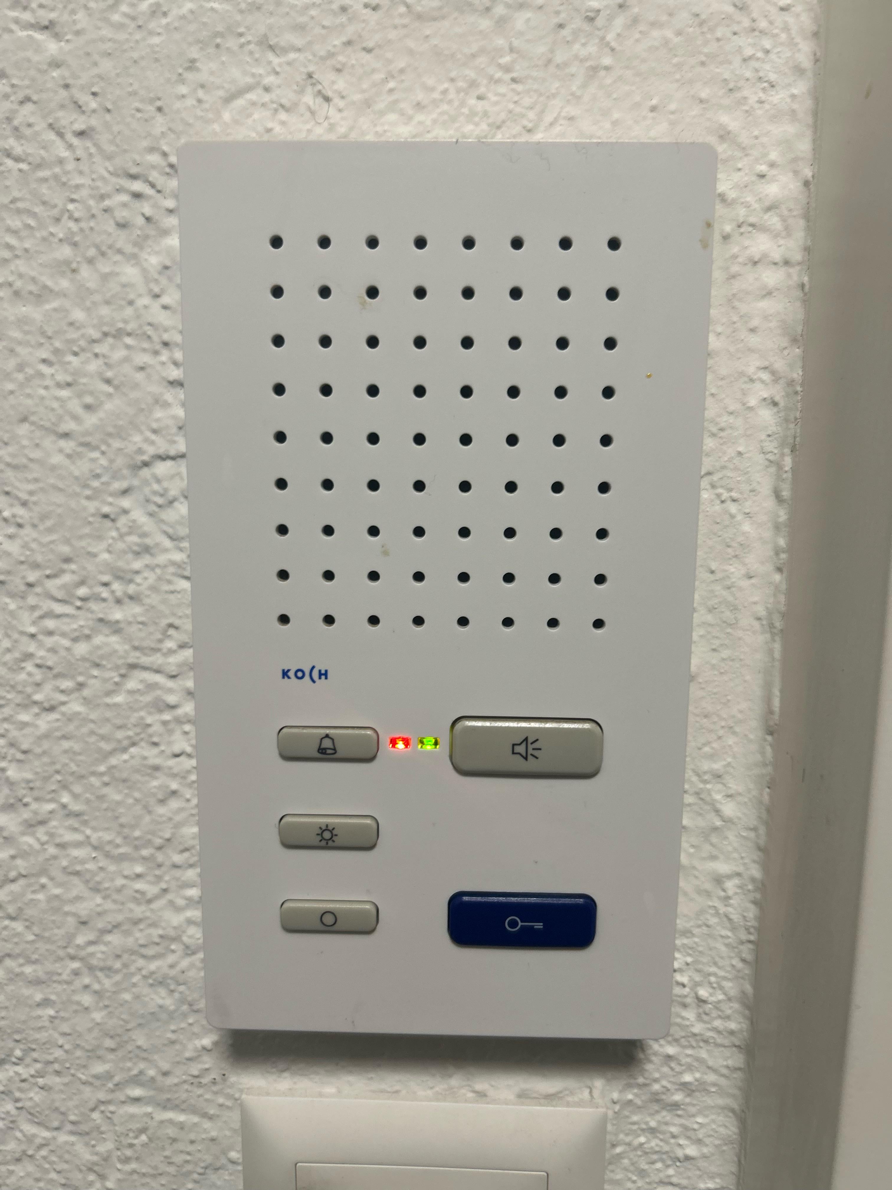 Your intercom shows one green and one red LED, which on KOCH indoor units almost always indicates a system fault on the building’s intercom bus — not a problem inside your apartment.